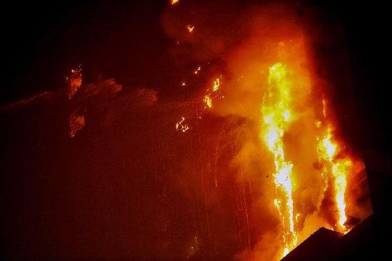 記者在凌晨1點多趕到現(xiàn)場的時候,南邊152米高的B座公寓已經(jīng)全部的燃燒,而且當(dāng)時火光沖天不時有燃燒物體往下凋落,上百名群眾在馬路對面圍觀。當(dāng)時已經(jīng)調(diào)集200多輛消防車和警方集結(jié)在周圍待命,但由于現(xiàn)場當(dāng)時火勢較猛,而且云梯車的高壓水槍只能噴射到50-60米的高度,也就是十層左右,再往上的火勢根本無法控制了,只能看著其燃燒。