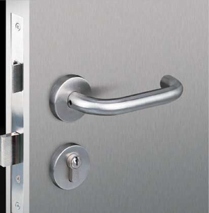 防火門專用鎖,包括鎖殼、鎖舌、旋鈕、鎖芯,其特征在于:鎖舌上有轉(zhuǎn)軸連接鎖殼,鎖舌上有撥塊,有一撥桿,撥桿為人字型,撥桿的中部有轉(zhuǎn)軸連接鎖殼,撥桿的頂端與鎖舌上的撥塊對應(yīng),撥桿中部有一外伸的撥叉,撥桿的后部伸出鎖殼,鎖芯連接偏心桿,偏心桿與撥桿中部的外伸的撥叉相對應(yīng),旋鈕上連接一偏心桿,偏心桿與撥桿中部相對應(yīng)能在發(fā)生火災(zāi)等危機(jī)情況時及時打開門鎖,而又能用鑰匙、旋鈕鎖定門鎖。