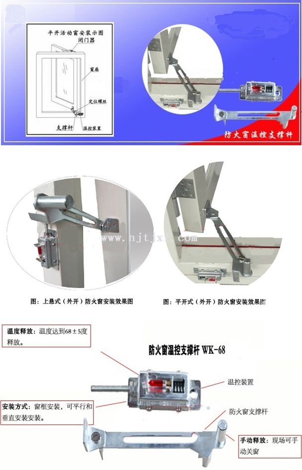 工作原理: 開啟狀態(tài)下,支撐桿可固定窗扇,讓其保持開啟狀態(tài),發(fā)生火災(zāi)時(shí)達(dá)到指定溫度,紅色感應(yīng)玻璃球爆裂,撞擊軸在彈簧作用下推動(dòng)支撐桿,釋放固定裝置,在閉門器的拉力下窗扇自行關(guān)閉。
