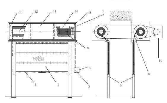 (1)座板; (2)簾板; (3)按鈕開關(guān); (4)手動(dòng)速放裝置; (5)導(dǎo)軌; (6)門楣; (7)限位器; (8)鏈輪; (9)卷門機(jī); (10)控制箱; (11)箱體; (12)卷軸; (13)支座 (14)電機(jī)
