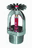 下垂型噴頭是由噴頭框架、溫感元件、密封件、濺水盤等組成,其中噴頭框架是采用銅合金材質(zhì)的精密鍛壓、外表層進(jìn)行鍍鉻拋光的制造工藝,使其具有框架強(qiáng)度高、耐腐蝕性強(qiáng)、外觀精美的特點(diǎn)。溫感元件(玻璃球)具有動(dòng)作可靠,反應(yīng)速度快。密封件具有抗老化、耐腐蝕、密封性好的性能特點(diǎn)。下垂型噴頭向下噴灑的水量為80%~100%。玻璃球的直徑為5mm[RTI 大于50(m·s)0.5且小于等于80(m·s)0.5]。依據(jù)玻璃球動(dòng)作的溫度不同而分為多種溫級噴頭。