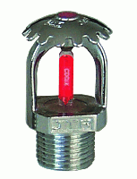 直立型噴頭是由噴頭框架、溫感元件、密封件、濺水盤等組成,其中噴頭框架是采用銅合金材質(zhì)的精密鍛壓、外表層進行鍍鉻拋光的制造工藝,使其具有框架強度高、耐腐蝕性強、外觀精美的特點。溫感元件(玻璃球)具有動作可靠,反應(yīng)速度快。密封件具有抗老化、耐腐蝕、密封性好的性能特點。直立型噴頭向下噴灑的水量為80%~100%。玻璃球的直徑為5mm[RTI 大于50(m·s)0.5且小于等于80(m·s)0.5]。依據(jù)玻璃球動作的溫度不同而分為多種溫級噴頭。