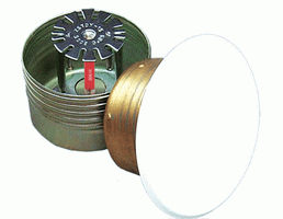 隱蔽式噴頭是由噴頭框架、溫感元件、裝飾片、支架、底托支架、密封件、濺水盤(pán)等組成,其中噴頭框架是采用銅合金材質(zhì)的精密鍛壓、外表層進(jìn)行鍍鉻拋光的制造工藝,使其具有框架強(qiáng)度高、耐腐蝕性強(qiáng)、外觀精美的特點(diǎn)。溫感元件(玻璃球)具有動(dòng)作可靠,反應(yīng)速度快。密封元件具有抗老化、耐腐蝕、密封性好的性能特點(diǎn)。隱蔽式噴頭玻璃球的直徑為5mm[RTI 大于50(m·s)0.5且小于等于80(m·s)0.5];3mm[RTI≤50(m·s)0.5],裝飾片與支架采用低熔點(diǎn)焊錫焊接(熔化溫度61℃±1℃)。將噴頭全部隱蔽在裝飾罩內(nèi)。當(dāng)火災(zāi)發(fā)生時(shí),裝飾片與支架之間的低熔點(diǎn)焊接金屬首先熔化,裝飾片脫落。當(dāng)玻璃球溫度達(dá)到動(dòng)作溫度時(shí),玻璃球爆破,噴頭噴水滅火。